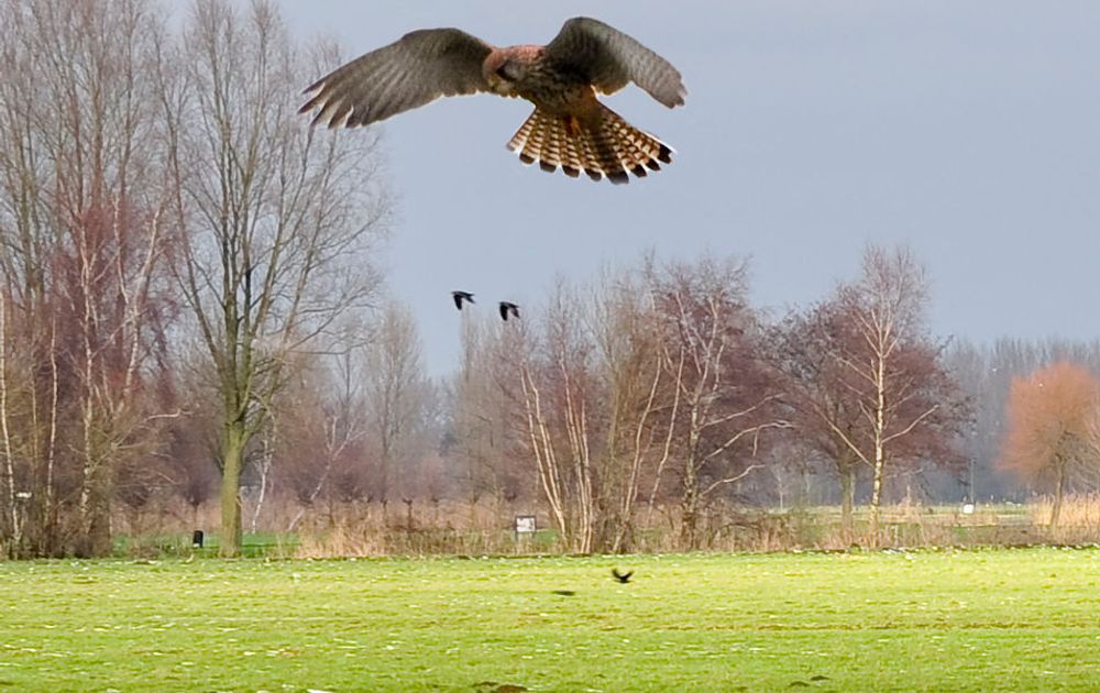 Biddende torenvalk om later de prooi op een paaltje te nuttigen.