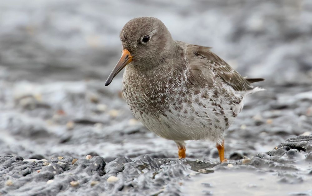 Het was erg hoog water op zee en door de harde wind stonden er hoge golven, waardoor de vogels op het talud zaten, waardoor ze vanuit de auto van dichtbij gefotografeerd konden worden. Deze Paarse Strandloper kwam op een gegeven moment recht op me aflopen.