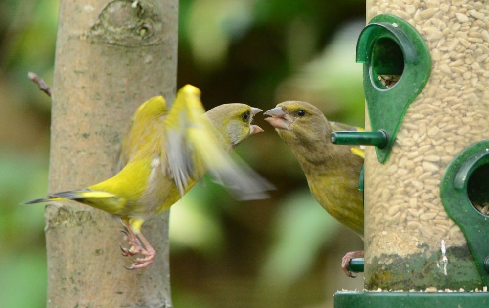 1e Kerstdag. Een nog jonge Groenling bedelt om voedsel bij een ouder.
