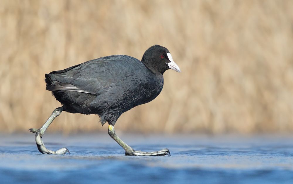 Er lag een dun laagje ijs op het water en het ijs was dik genoeg om de meerkoet te dragen