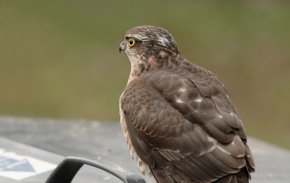 Mijn kliko-sperwer op haar favoriete kijkplek bezien vanuit het keukenraam bij de vogelvoerplank