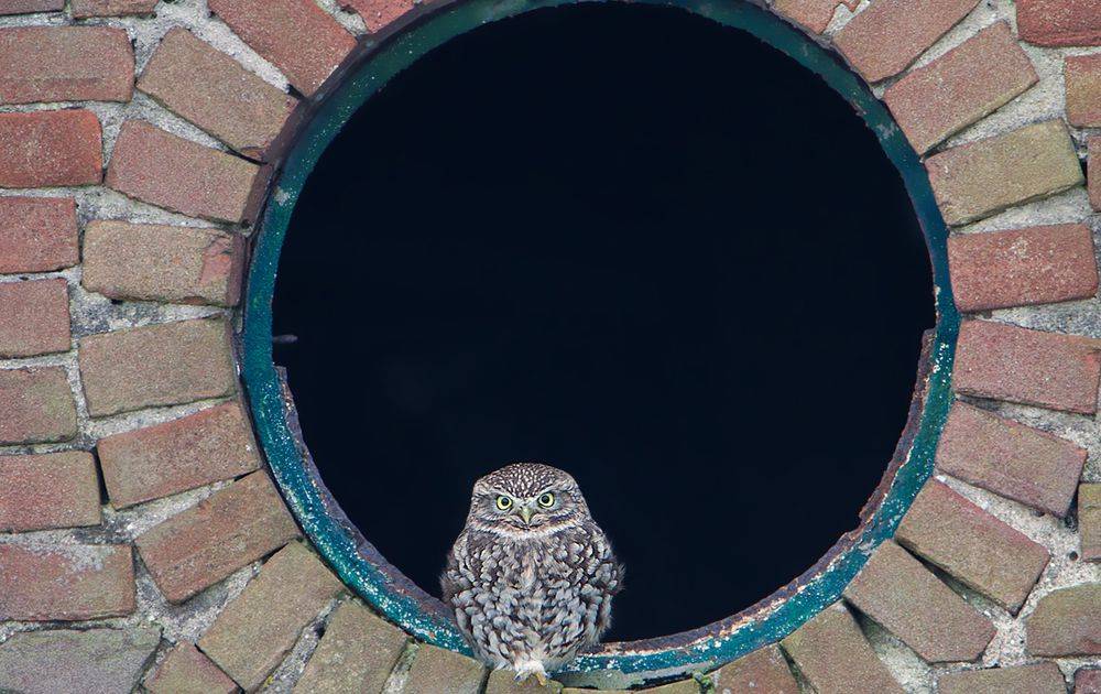 In net raam van een oude vervallen schuur zat deze Steenuil op zijn gemak. Vanaf de dijk kunnen fotograferen, waardoor we redelijk op gelijke hoogte waren.