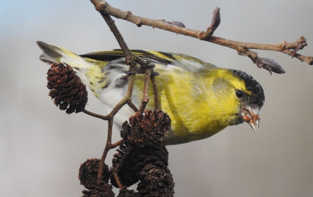 Een sijsje die geniet van de elzenproppen