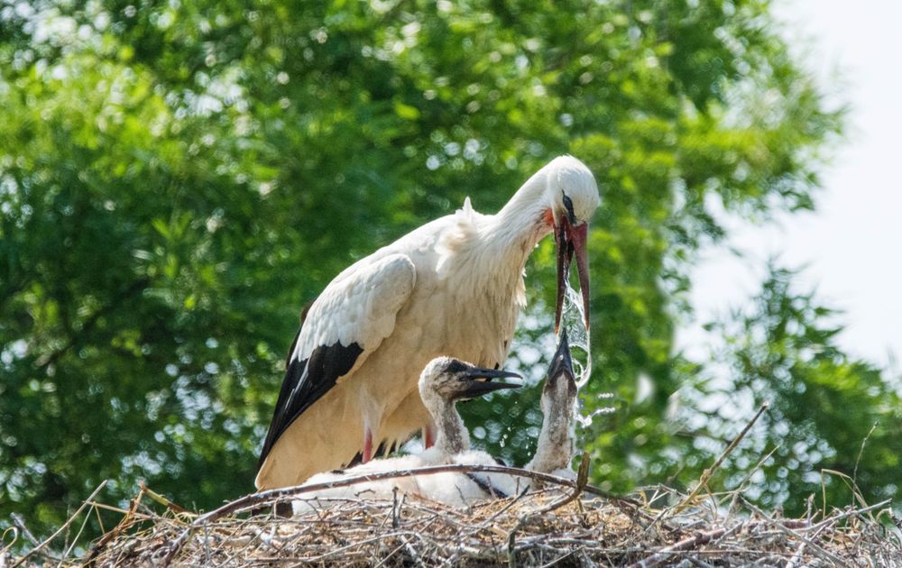 ooievaars jong(en) krijgen te drinken door moeder vogel.......