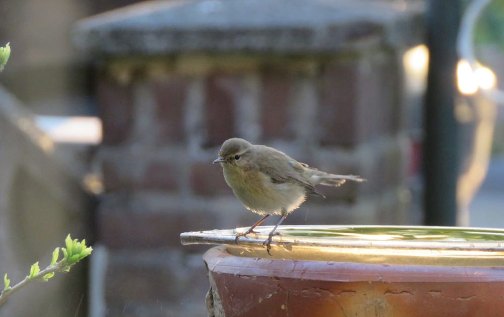 Tjiftjaf kwam net uit het vogelbadje en vloog na de foto weg.