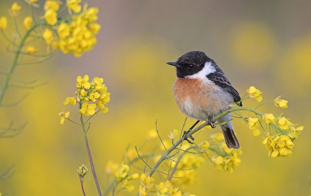 Het koolzaad staat in bloei, en als je goed op let zit er soms een vogeltje op. Als het vogeltje ook nog eens wil blijven zitten voor de foto heb je echt een geluksmoment.