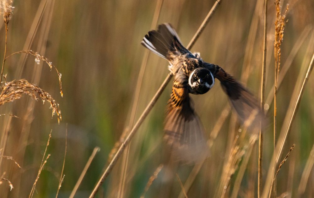 Ik stond al een tijdje rietgorzen te fotograferen toen dit mannetje steeds dichter bij kwam al springend van stengel naar stengel. Het lukte me om op precies het goeie moment af te drukken, met deze dynamische foto als resultaat!