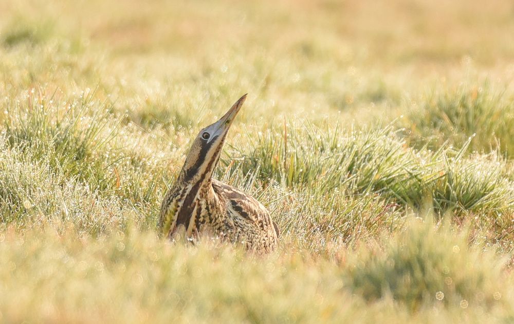 De Roerdomp laat zich zelden zien en soms hóren. In het riet bijna niet te spotten. Hier "betrapte" ik m even in het open weiland, 's-morgens vroeg. Direct in een soort gehurkte paalstand, wat zo kenmerkend is voor deze soort.