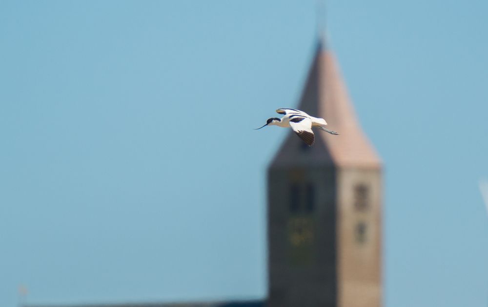 Op de achtergrond de toren van de Michaelskerk op Oosterland. De 'voorbij vliegende' kluut maakt voor mij de foto bijzonder.