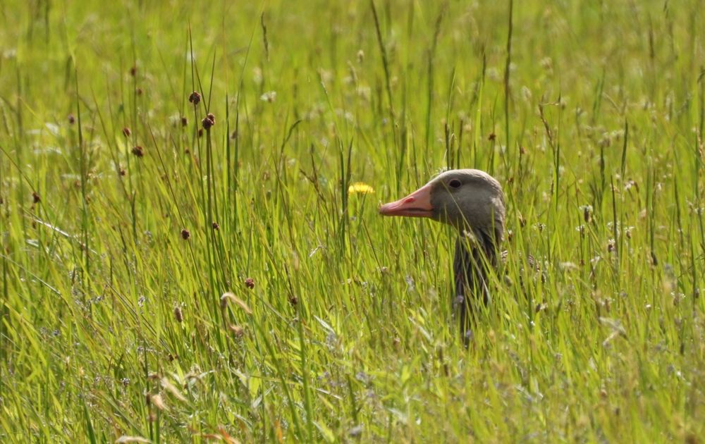 Geheel onverwacht stak deze grauwe gans zijn kop boven het hoge gras uit. Later bleken er nog vier te zitten.