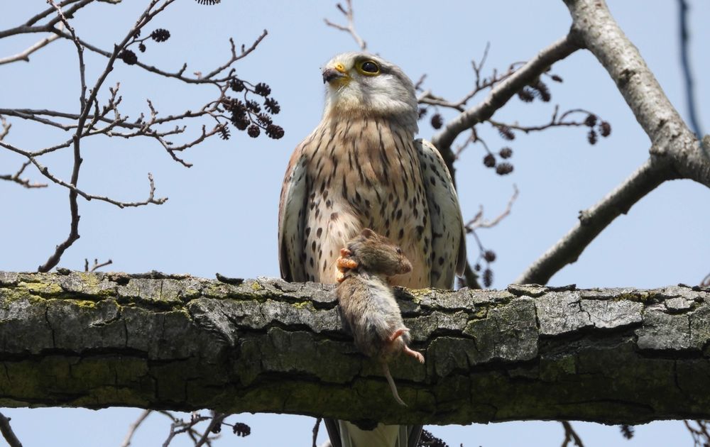 Ik zag de torenvalk een muis slaan in het hoge grasveld. Daarna vloog de valk met muis in een hoge boom naast mij. Verschillende jonge torenvalken vlogen rondom deze boom. Prachtig schouwspel