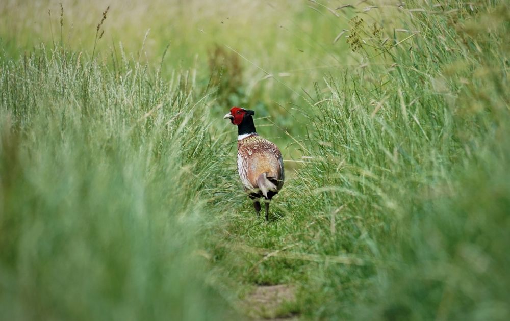 Een echtpaar fazant stak plots het wandelpad over. Vrouw liep al verder, maar de man bleef nog even nieuwsgierig kijken