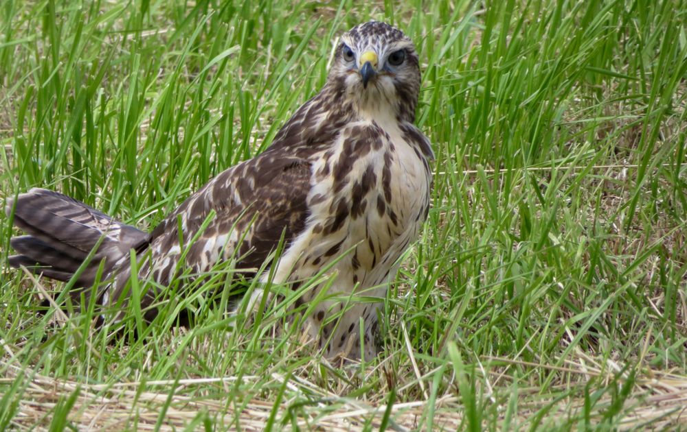 Buizerds zitter er steeds met zijn vieren in een wei en je kan ze bijna aanraken
