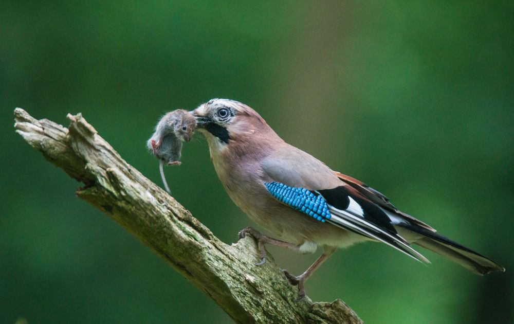 De gaai sprong al een tijdje rond voor de schuiltent tot hij plots met een muisje in beeld kwam. Nog net een foto kunnen maken voor hij weer verdween.