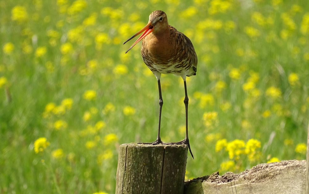 Ondanks een harde wind blijft de grutto keurig op een poot staan