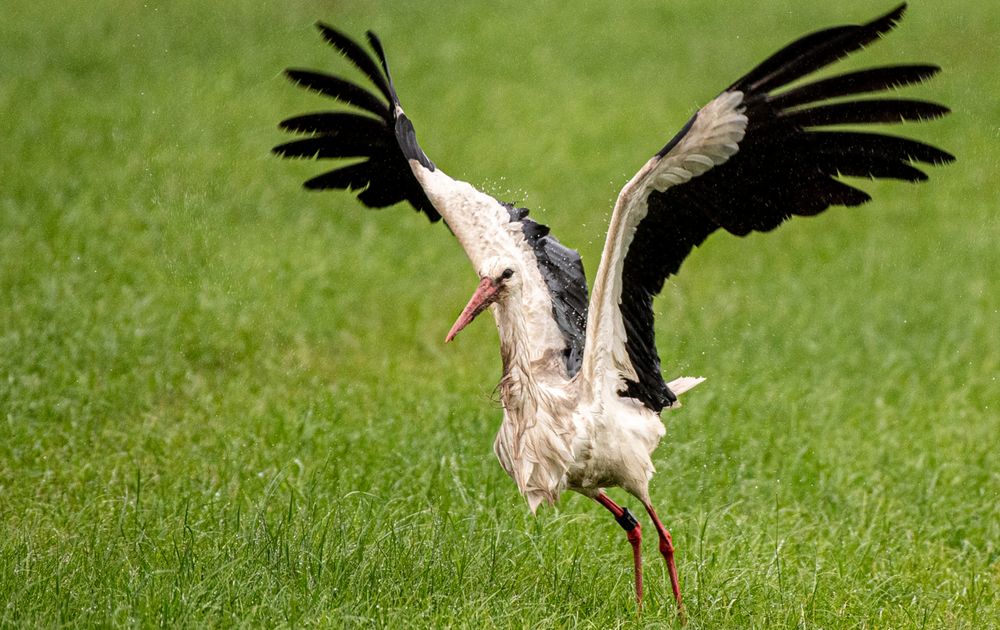 Tijdens onze regenachtige vakantie in het Friese Munnekeburen zagen wij veel ooievaars. Op deze foto schudt een ooievaar de druppels van zijn veren.