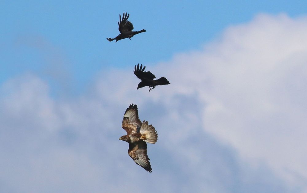 De buizerd is groter, de kraaien behendiger.