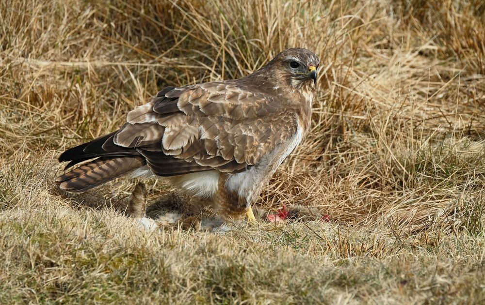 De buizerd had net zijn prooi (een konijn) te pakken daarom bleef hij mooi even poseren.