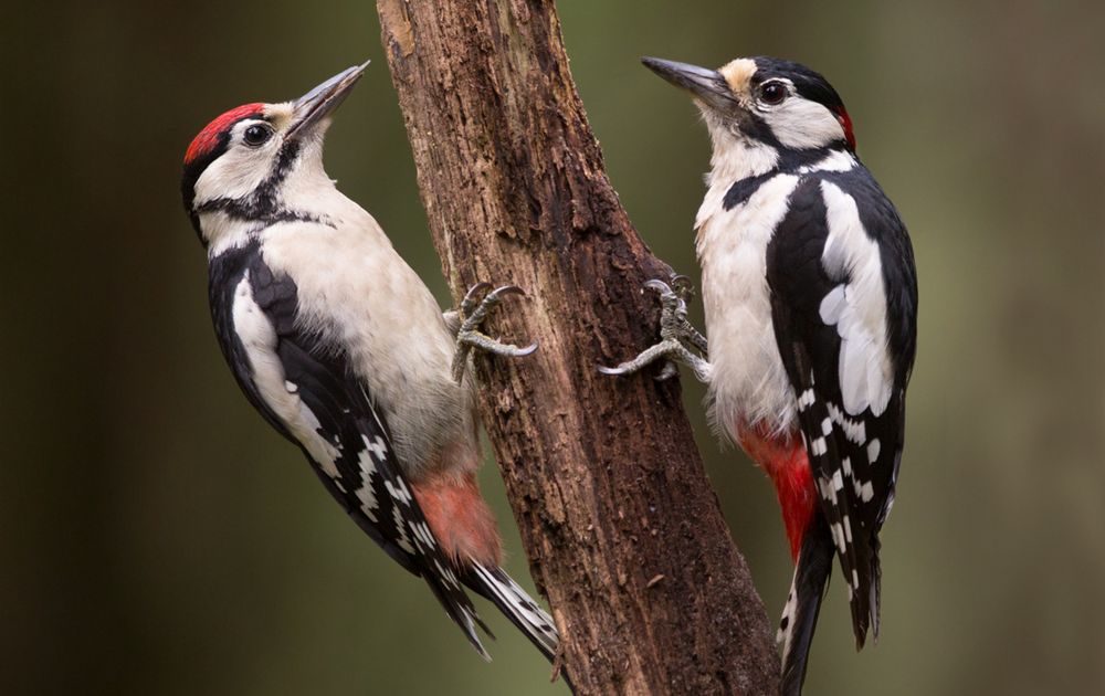 De jonge grote bonte specht bleef bedelen om voedsel bij pa specht.