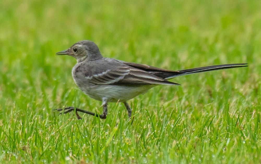 Jonge witte kwik op zoek naar een hapje in het natte gras