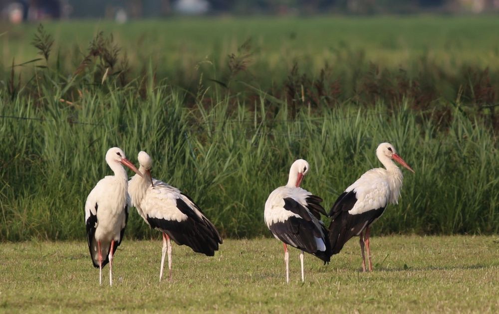 Even buiten Groningen waren ooievaars in een weiland te zien. Tegen de avond waren er meerdere vogels bij elkaar gekomen. Allemaal de veren aan het poetsen. Mooi om te zien.
