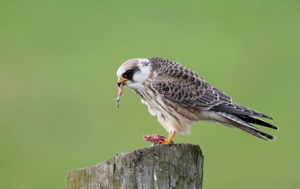 Juveniele Roodpootvalk eet van een gevangen muis.