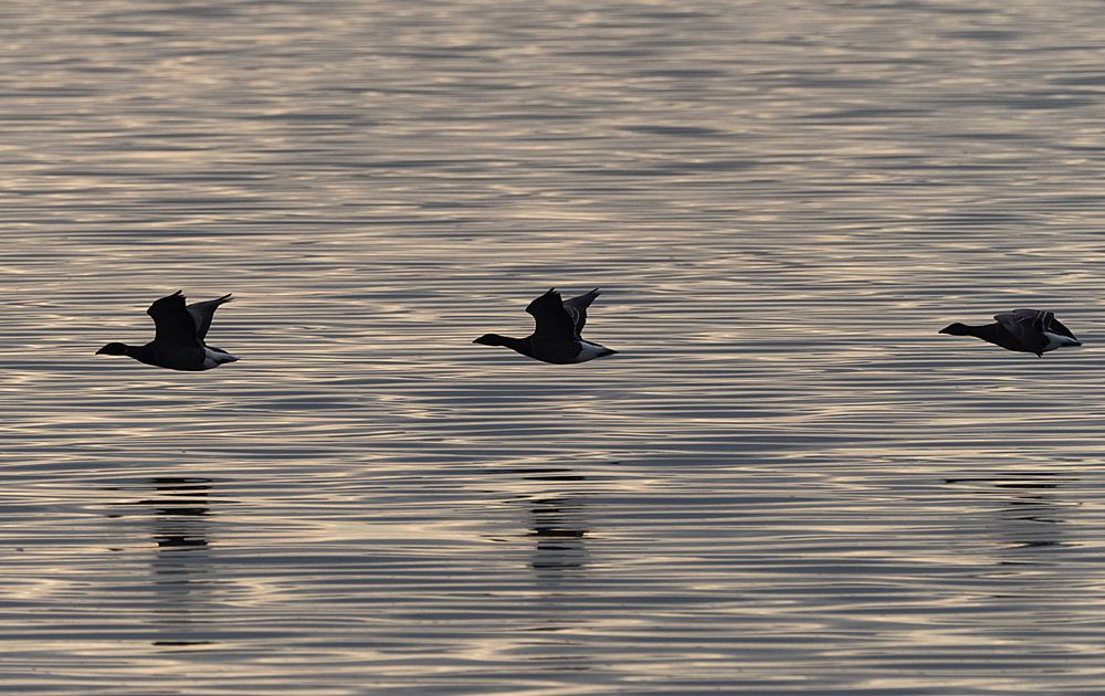 Drie Rotganzen laag over het Wad, met een fraaie lijnenspel in het water.