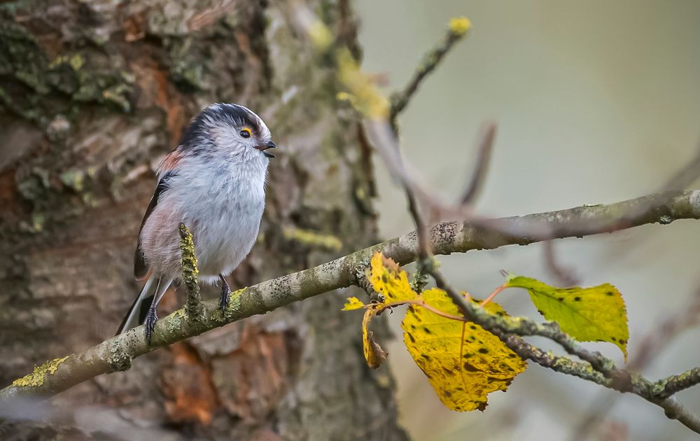 Uit een groepje van in totaal 6 mezen, koos deze mees een takje uit voor een ultra-korte tussenstop, waarbij ik snel kon afdrukken... De herfstkleuren van de bladeren en de mossen op het takje komen onder de bewolkte hemel goed tot hun recht.