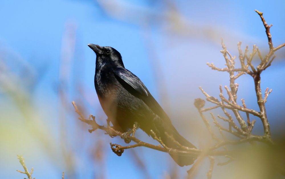 Deze kraai zat hoog in de boom. De zon scheen, de lucht was blauw. Ik denk dat ie het net zo mooi vond als ik.