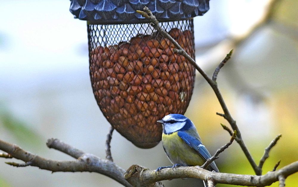 Koolmees voor de eikel gevuld met pinda's, gaat zich te goed doen aan het lekkers.