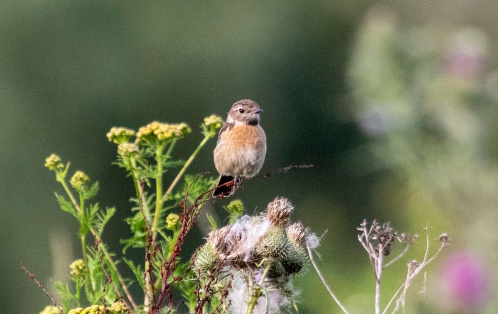 een mooie zomeravond en regelmatig zaten roodborsttapuiten op zaad dragende bloemen of distels.