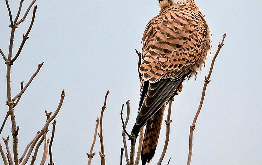 De torenvalk speurde naar elke beweging in de weilanden vanuit de hoogste takken van de boom. Het zachte licht van een bewolkte hemel doet zijn veren goed uitkomen (200-500mm, 1/1000sec, f/7.1, iso 800).