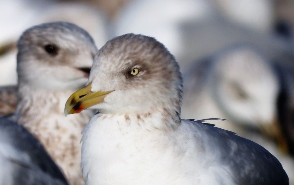 Zomaar een groepje grauwe meeuwen op de vloedlijn. Wat moet je daarmee als fotograaf? Nou, dit!