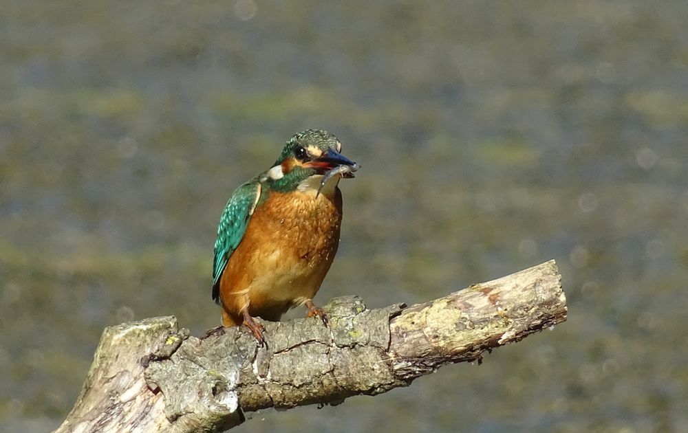 Ijsvogel zat een tijdje op de tak op eens dook ze in het water en ja hoor ze had een visje te pakken .