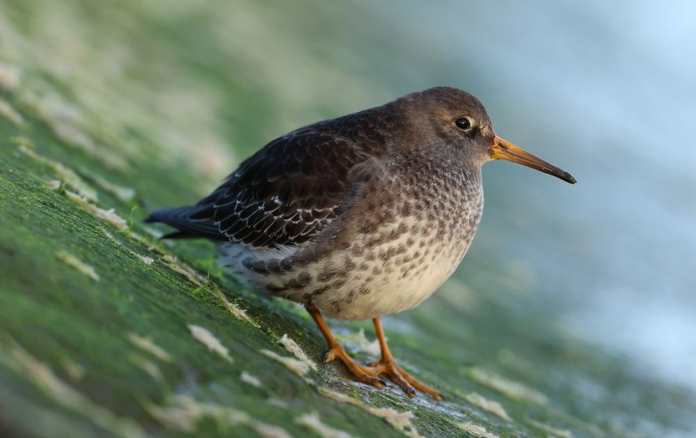 Prachtige Paarse Strandloper liep op de spekgladde stenen in het haventje van De Cocksdorp aan de Waddenzee op Texel. Het was in het laatste zonnelicht van de winterse dag.