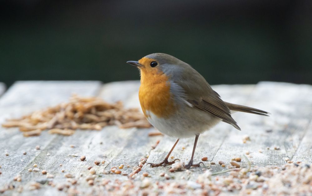 Roodborstje kwam eten van voer dat op de tuintafel lag