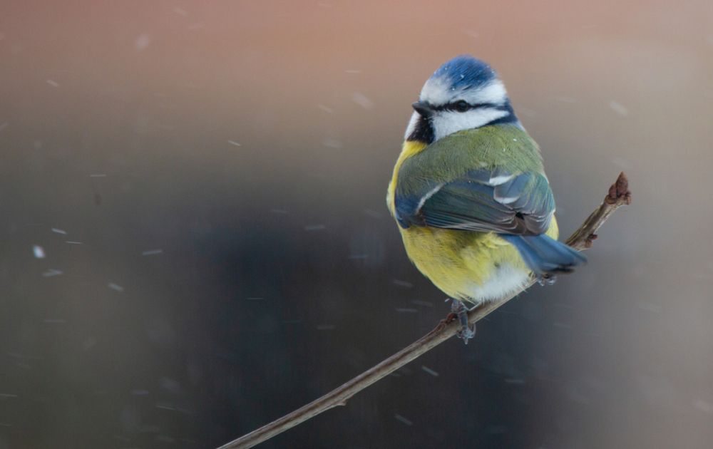 Mooie eyeliner! De pimpelmees ziet de sneeuwvlokken neerdwarrelen.