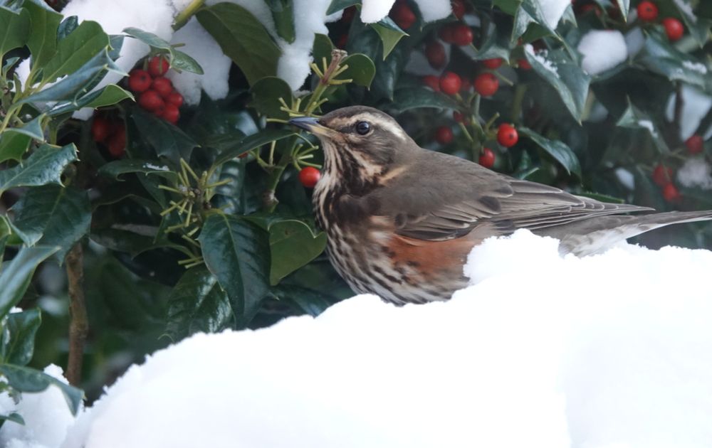 Aantal, ongeveer 10stuks koperwieken doen zich tegoed aan de bessen van de hulst boom.