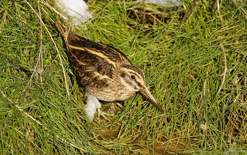 Voor het eerst een Bokje gezien, die niet direct opvloog. Er waren er twee aan het foerageren in een slootje. De Bokjes liepen steeds tussen de begroeiing, maar kwamen langzaam mijn kant op, waar een open stuk was. Deze foto maakte ik toen een van de vogels uit de begroeiing kwam. Ze trokken zich niets van me aan en bleven rustig doorgaan met voedsel zoeken.