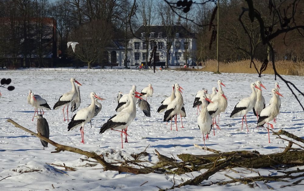 Ooievaars en Reigers kregen eten van de vrijwilligers van de natuurmonumenten. Het was zo leuk om dit te zien er waren 31 Ooievaars en paar Reigers