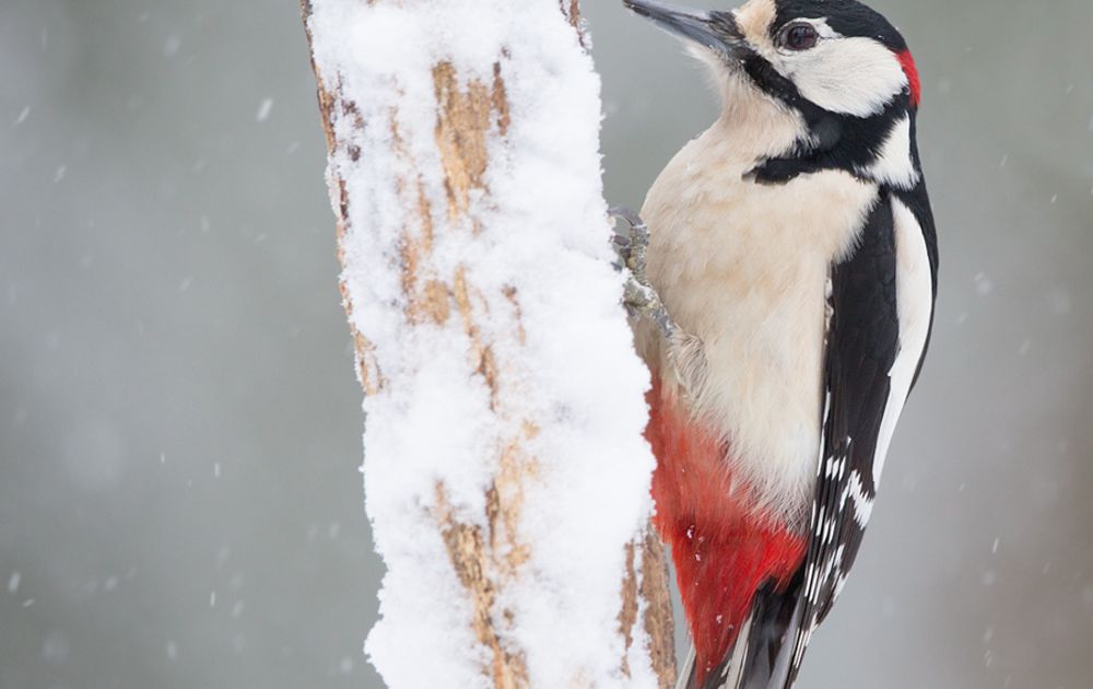 De Grote Bonte Specht kwam regelmatig voor de hut om wat pindakaas te snoepen.