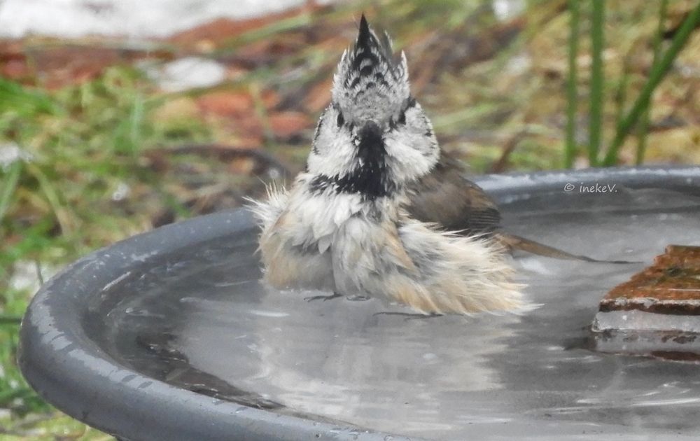 Deze foto heb ik vandaag (16-2-2021) genomen. Kuifmees zat lekker in het bijna ontdooide vogel-bad te badderen, maar het leek soms nèt alsof hij door het ijs zakte! :-)