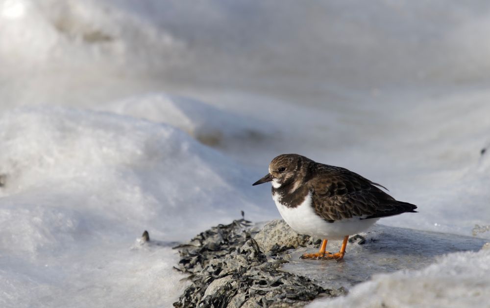 De meeste Steenlopers verscholen zich tussen de ijsschotsen en stenen tegen de snijdend koude wind, deze steenloper kwam even zijn beschutte plekje uit om een blik te werpen op het ijs van de Waddenzee.