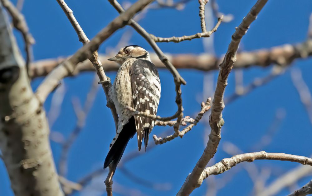 Prachtig om te zien, deze kleine bonte specht vrouw, hoe zij aan de takjes hangt om te eten