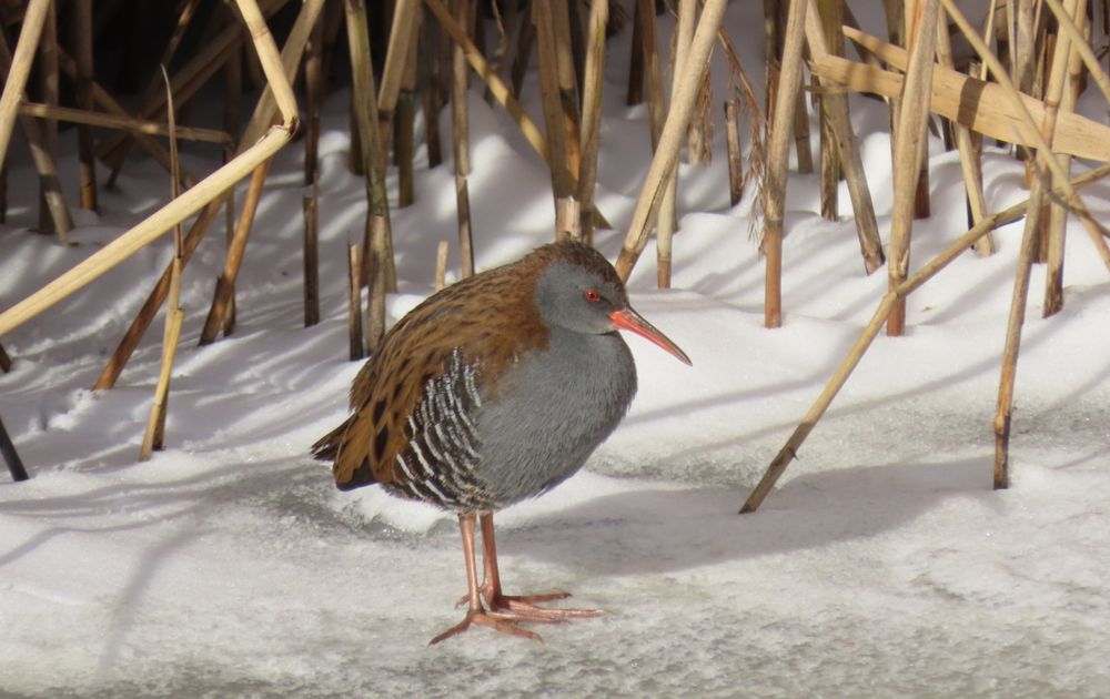 Schichtig aan de rand van een bevroren sloot, tussen het riet