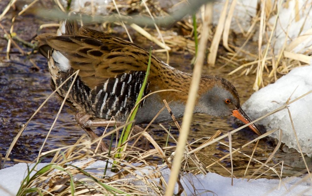 Waterral op zoek naar wat voedsel op het ijs.