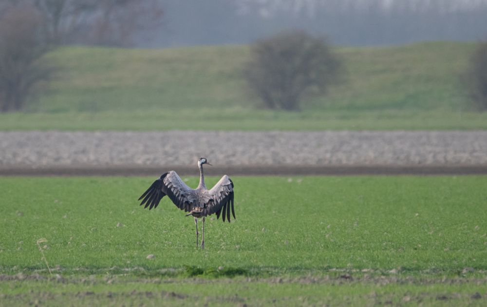 Tijdens de voorjaarstrek heb je de kans om kraanvogels te spotten in onze omgeving. Zo ook dit exemplaar die rustig aan het foerageren was in een net ingezaaide akkerveld.