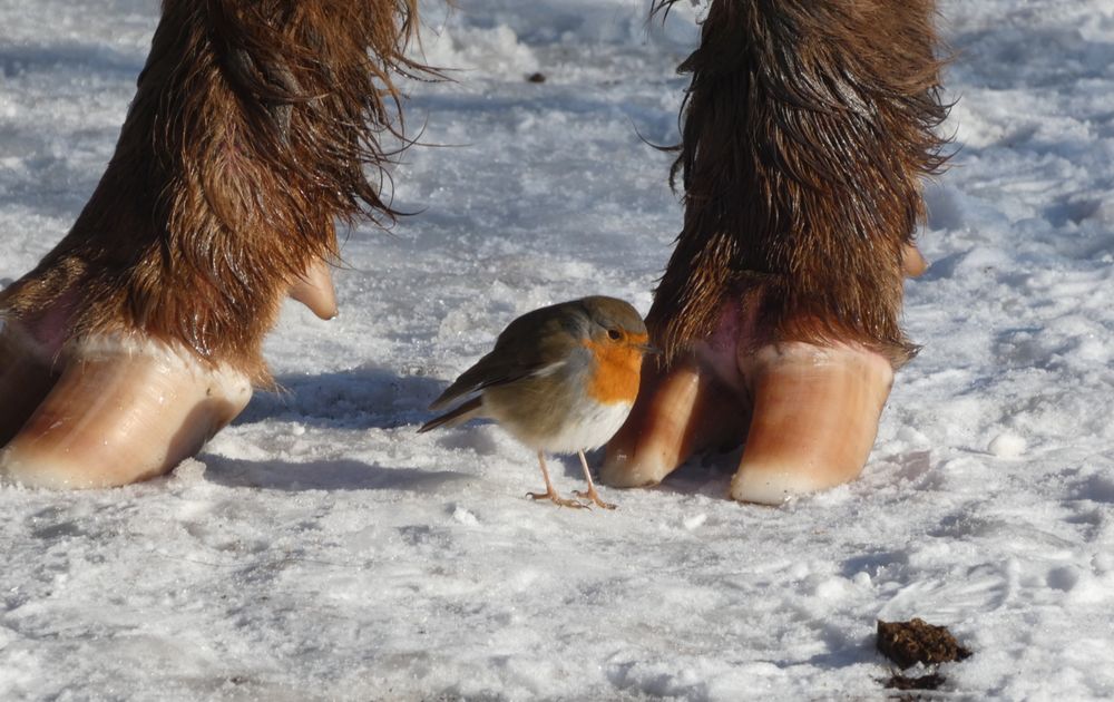 Ik was foto's aan het maken van de Hooglanders, toen er plots een roodborstje tussen de achterpoten van een jonge Hooglander ging zitten. Vond het zo dapper!