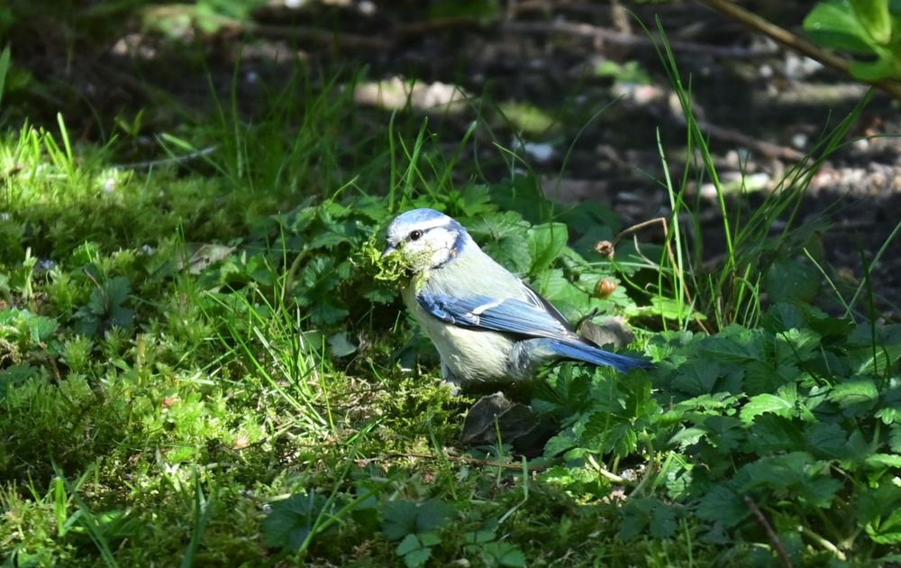 Pimpelmees is een groot deel van de middag bezig geweest om gras en mos te halen voor zijn nest.