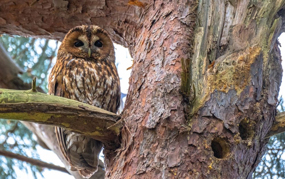 Tijdens een wandeling op een regenachtige dag hoorde ik de alarmroep van twee merels, en ging op onderzoek uit. Daar zat hij, prinsheerlijk, hoog en droog onder een dikke tak van een grove den. De ijverige specht die kort daarvoor nog gaten in de den had gehakt zal zich voorlopig even niet laten zien...